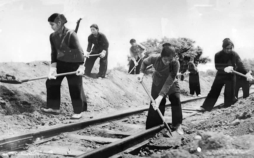 Đội nữ anh hùng thuộc Đội công trình 609 (nay là Công ty CP Công trình 6) xuất hiện trên nhiều cung đường sắt. Họ vác tà vẹt, khiêng ray, gánh đá, san lấp đường (Ảnh tư liệu).